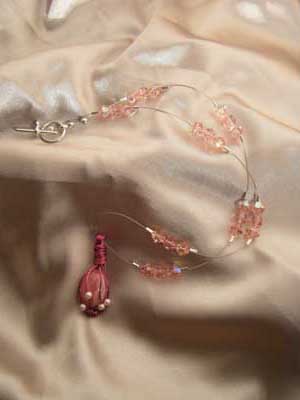 JACY This 18" necklace features segmented pink Swarovski crystals and a wire-wrapped rhodochrosite stone focal point.