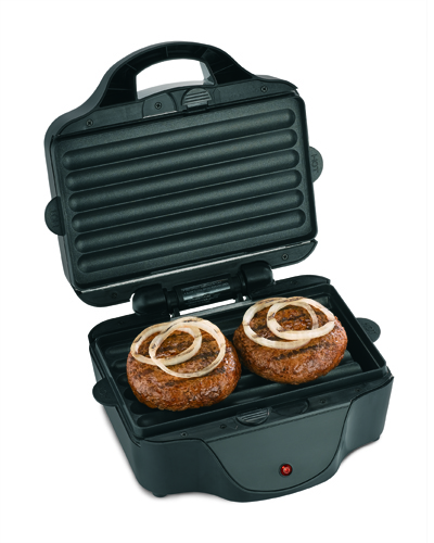 PROCTOR SILEX INDOOR GRILL BY HAMILTON BEACH Removable grids for dishwasher cleanup. Perfect for 1-2 servings. Power "on" light. Removable drip tray. Compact upright storage.